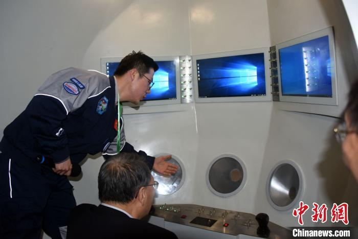 廖佳伟在“奋斗者”号高仿真模型舱内科普讲解。 孙自法 摄