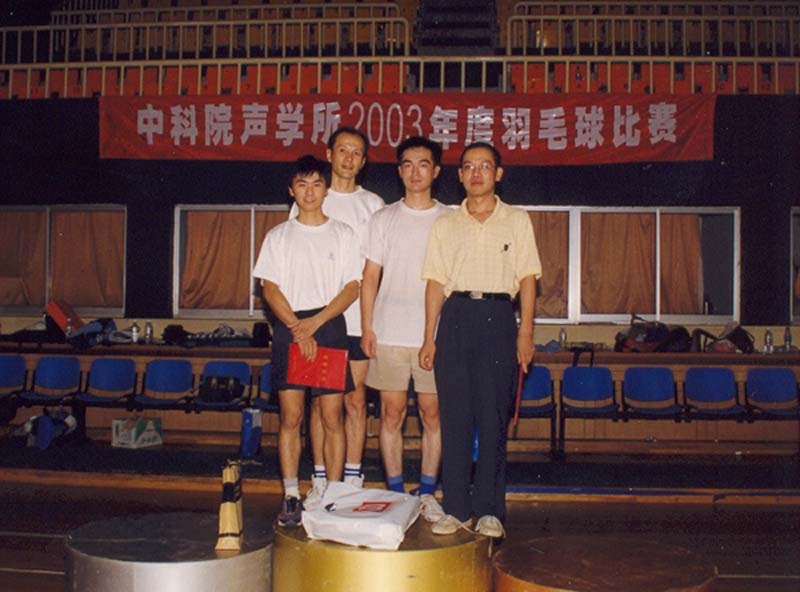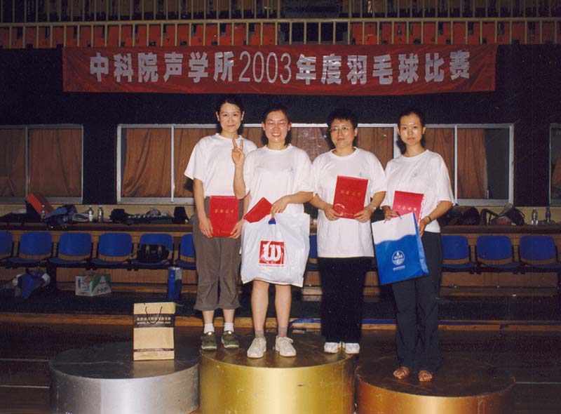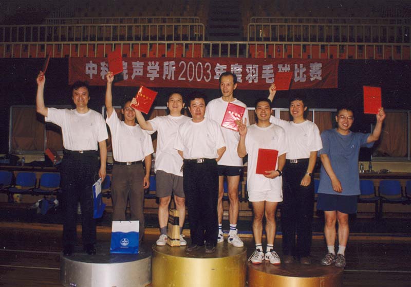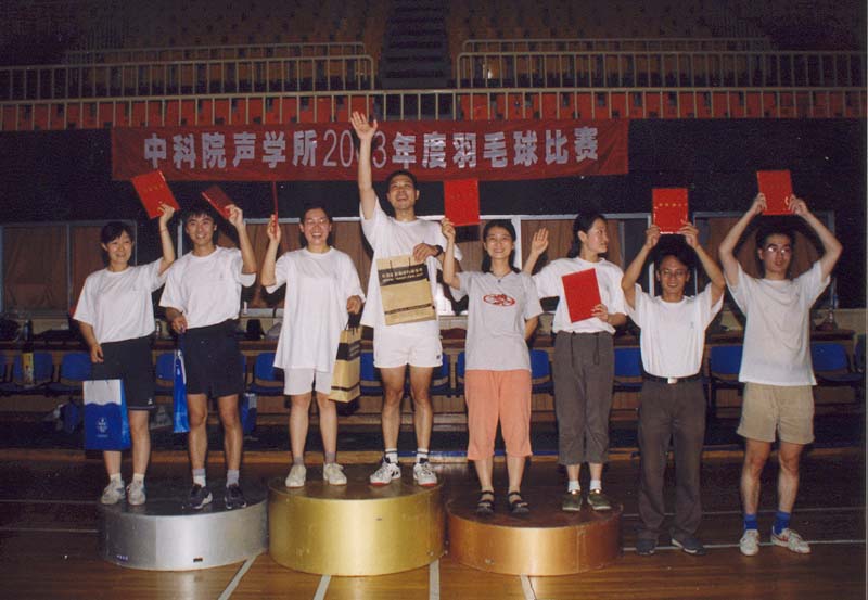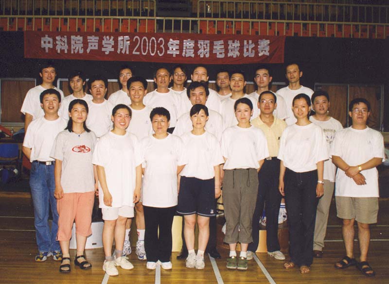 7月25日傍晚17:30,一辆满载着所领导、运动员、裁判员和观众队伍的大客车准时从声学所门口出发,开往海淀体育馆。18:00总裁判长一声令下,全所职工和学生热切关注的声学所2003年度羽毛球赛决赛在海淀体育馆打响了。