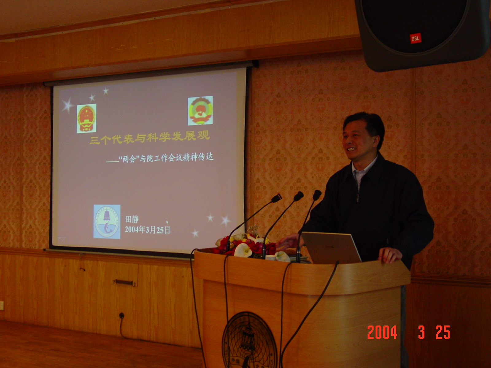 田静所长说,我们国家现在正处在一个重要的战略机遇期。我们要坚持科学的发展观,正确处理改革、发展和稳定的关系。作为中科院的研究所,更要珍视来之不易的发展机会,审时度势,加快发展的步伐。