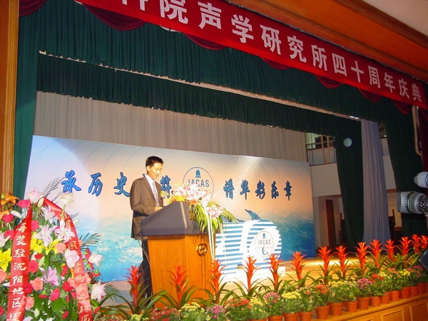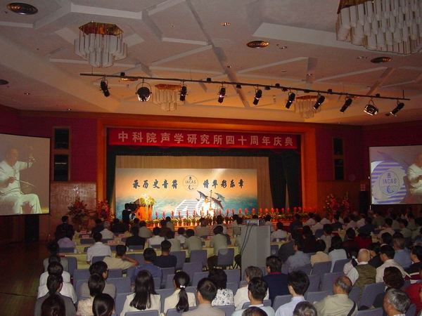 2004年7月1日,在中国共产党成立83周年的喜庆日子里,中国科学院声学研究所也迎来了建所四十周年华诞。上午10时,庆祝声学所成立四十周年庆典大会在北京友谊宾馆友谊宫(聚英厅)隆重召开,声学所科研人员、职工、学生和嘉宾近千人参加了庆祝大会。中国科学院副院长、院党组成员江绵恒同志到会并表示祝贺。国家科技部等一百多个单位的领导和同志参加了庆祝大会。