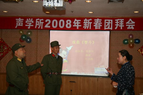 开心锣鼓闹喧天,爆竹声声又一年,辞旧岁,迎新春,声学所2008新春团拜会在一片欢呼与掌声中拉开了序幕。新春团拜会是声学所一年一度的最盛大的全所联欢活动,由所办公室、工会、团委、研究生会联合举办。大家自编自导自演的小节目,丰富多彩的小游戏,还有极具诱惑力的抽奖活动,吸引着声学所的每一个人。每年这个时候,所各级领导与全所职工和学生齐聚在DSP大楼多功能厅,欢歌笑语,一同度过这段温馨美好的时光。