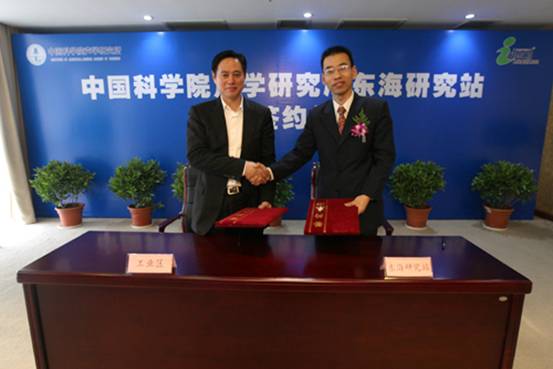 东海研究站站长胡长青和嘉定工业区党工委书记郁建华代表院地双方签署合作协议