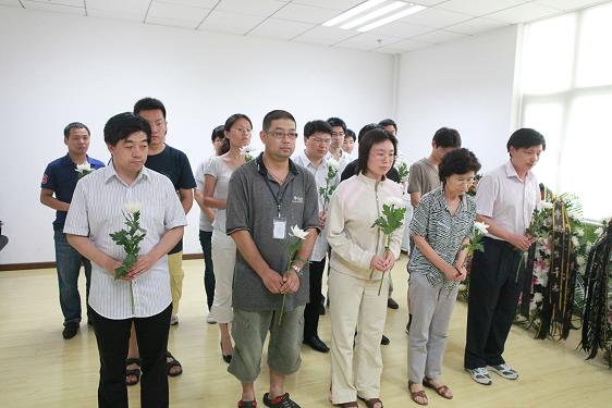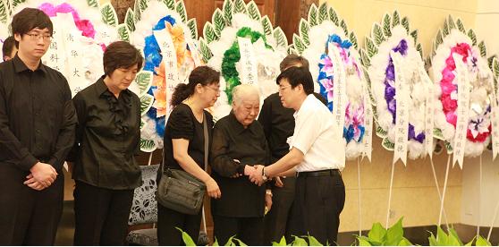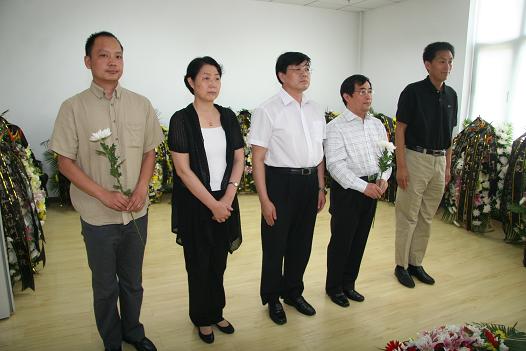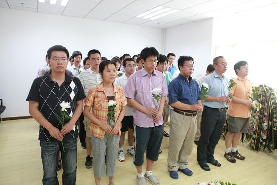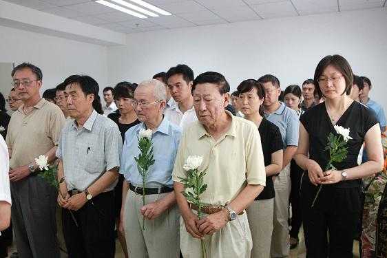 6月30日晚,噩耗传来,全所上下十分悲痛。在应崇福院士治丧委员会的指挥下,应院士治丧办公室连夜在所内设立了灵堂,供全所同志和社会各界人士前来悼念应崇福院士,表达缅怀之情。灵堂庄严而肃穆,灵堂门口“崇山之尊 先于人杰 安乎超然;福海之阔 生于地灵 息乎空化”的挽联寄托了对应先生无尽哀思。灵堂内哀乐低迴,束束鲜花簇拥着应先生的遗像,所领导、机关各职能部门及实验室的同志们24小时为应先生守灵。声学所各实验室、机关以及后勤保障部门的科研管理骨干、广大职工及青年学子500余人,自发地集体到灵堂追思应崇福院士。中科院高技术局田静局长、国家自然基金委张守著处长、张仁和院士、李启虎院士、侯朝焕院士、汪承灏院士,以及来自有关研究所领导、中国科大、清华大学、中科院研究生院、南京大学、同济大学、中国声学学会、中国声学标准化技术委员会、中科院侨联及海淀区侨联等单位代表闻讯纷纷赶到灵堂吊唁。