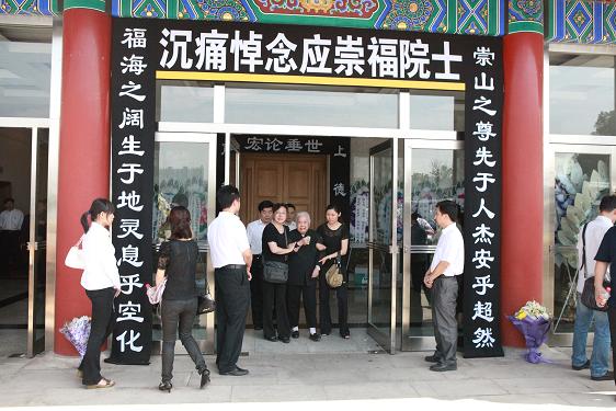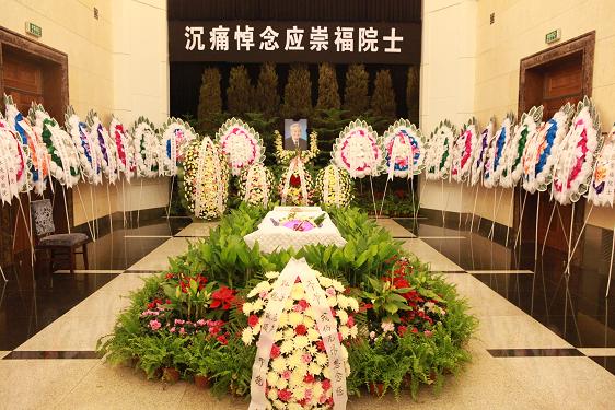 7月4日8点30分,应崇福院士遗体告别仪式在北京八宝山东礼堂举行。告别厅灵堂前高悬着“上德若谷声超穹宇”的挽联以及“宏论垂世”的挽幛。肃穆的灵堂中央,应先生的遗体安放在鲜花翠柏丛中。遗像两侧,党和国家领导人温家宝、李长春、习近平、李克强、刘延东、李源潮、张德江、吴官正、中科院院长白春礼、中科院高技术局局长田静、诺贝尔奖得主、著名物理学家杨振宁等个人以及中央组织部、中国科学院学部主席团、中国科学院院士工作局、国家自然科学基金委员会数理科学部、北京市政协办公厅、宁波市人民政府、清华大学、中国科大、河海大学、中科院研究生院、中科院侨联、中国华侨历史博物馆、中国声学学会、中国机械工程学会等单位敬送的花圈依次排列,简洁而庄重。
