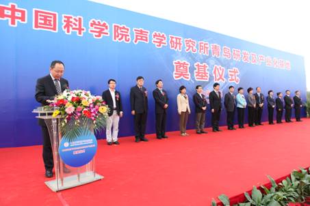 2012年10月26日上午,中国科学院声学研究所青岛研发及产业化基地奠基仪式在青岛国家高新技术产业开发区举行。山东省科技厅党组书记、厅长翟鲁宁,中共青岛市委常委、红岛经济区工委书记、管委主任、高新区工委书记陈飞,青岛市政协副主席、青岛大学副校长邵峰晶,青岛高新区工委副书记、管委主任赵兴书,中国科学院声学研究所所长王小民等领导出席奠基仪式,并共同为声学所青岛基地建设项目奠基培土。