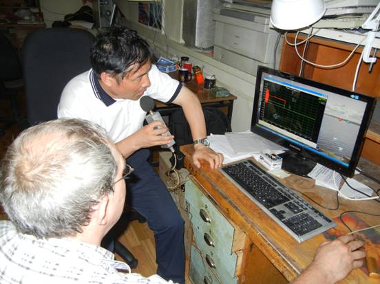 俄罗斯大气物理所副所长Sergey Kulichkov和Igor Chunchuzov研究员与中方访问团进入了深入的探讨.杨亦春研究员向俄方讲述了声学所噪声与振动实验室近年来在次声领域研究的进展以及计划的研究发展方向――广域次声传感器网络的建设和次声与包括地震事件在内的自然事件关联性研究. Sergey Kulichkov副所长表示他本人曾研究过地震期间次声信号,对中方提出的地震前期次声信号分析的设想十分感兴趣.他还展示了该所研究的基于PE模型的各向异性风速场和不均匀性的温度场对低频声波散射的分析软件,该模型能够很好的解释地面爆炸次声波经过大气远距离传播的观测数据.经过两个多小时的深入交流,双方增进了解,达成了广泛的共识:由于地震本身活动的复杂性,研究其与次声的关联是一项富有挑战性的课题,双方认为在中方布设的广域次声传感器网络的基础上,利用俄方研究的次声大气远距离模型来尝试定位预报是解决这一难题的有效方案;双方表示应该加强双边互访,增加双边交流合作.