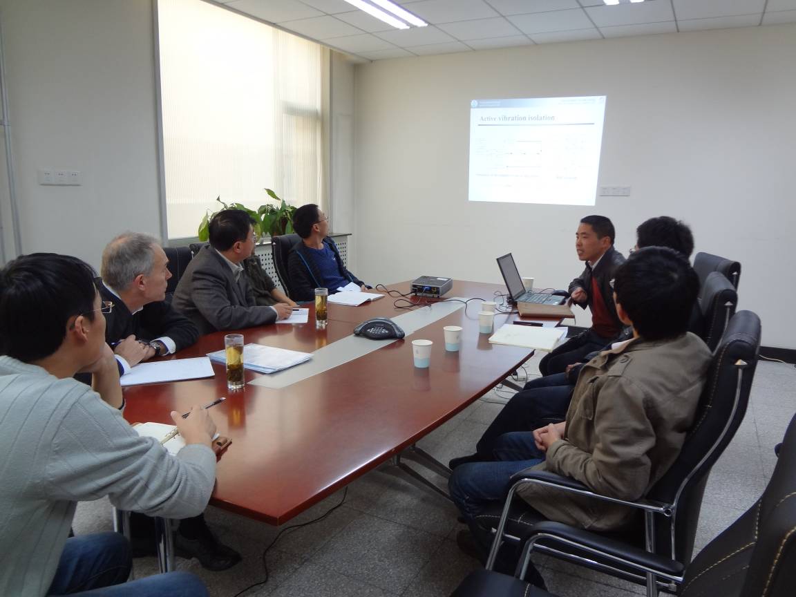 13日下午,杨军主任、孙红灵副研究员和从事相关研究的十几名学生与Elliott教授进行了深入研讨。杨军主任介绍了中科院声学所、噪声与振动重点实验室的基本情况以及目前进行的相关研究工作;孙红灵副研究员详细介绍了有源噪声与振动控制小组所进行的管道噪声有源控制、主动隔振、分散式主动控制等方面的研究成果。Elliott教授给予了高度评价并给出了中肯的建议。雷成友、肖龙帅、刘力、蔡野峰等学生也分别介绍了自己的研究工作,并与其进行了深入的讨论。此外,根据2011年双方签署的合作备忘录,杨军主任和Elliott教授详细讨论了下一步的合作交流计划。