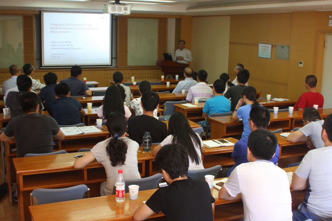 应声学所超声技术中心王秀明主任的邀请,新加坡国立大学的Arthur Cheng教授和中国石油东方物探公司的余刚博士于2016年8月31日来访声学所,并分别作了题为“Integration of borehole acoustic, borehole seismic, and rock physics measurements”和“Walkaway VSP using multimode optical fibers in a hybrid wireline”的学术报告,会议由王秀明主任主持,超声技术中心的张海澜研究员、林伟军研究员、丛健生研究员、陈德华研究员、陈浩研究员等参加了报告会。