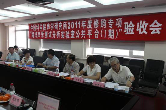 2012年8月27日,中国科学院计划财务局修购专款设备项目管理办公室(以下简称“专项办”)组织专家对声学所承担建设的 “海洋声学测试分析实验室公共平台(Ⅰ期)”项目进行了验收。专项办主任田东生、业务主管申孟芝,院海洋科学大型仪器区域中心代表李军,声学所修购专项工作组组长、副所长、党委副书记倪宏,工作组副组长、副所长李风华以及工作组相关人员刘宏伟、李红廉、刘卫华、王秀明、杨军等出席了本次会议。田东生主任主持召开了项目验收会议,专家组听取了工作组代表、行政资产处处长刘宏伟所作的项目工作报告和财务报告,现场复查了设备运行情况和档案资料。