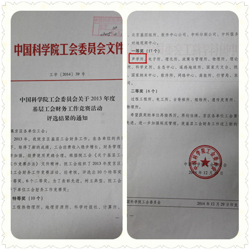 为切实加强工会财务的监督和管理,规范工会经费收支渠道,推进基层工会规范化建设,院工会组织了2013年度京区基层单位工会财务工作竞赛活动,从组织建设、经费收支、财务管理、经费使用等四个方面进行认真细致评选,声学所工会财务在此次活动中荣获一等奖。