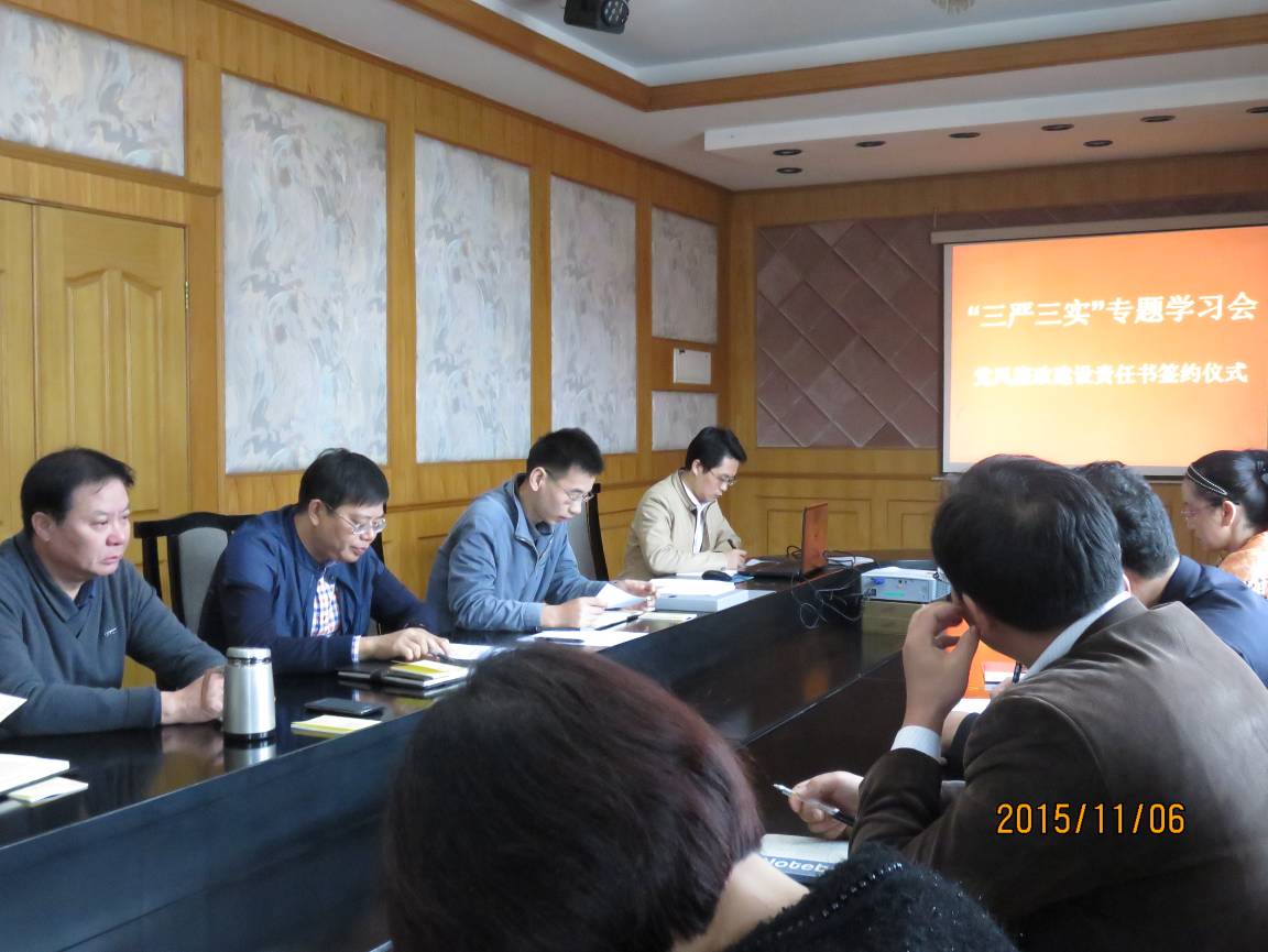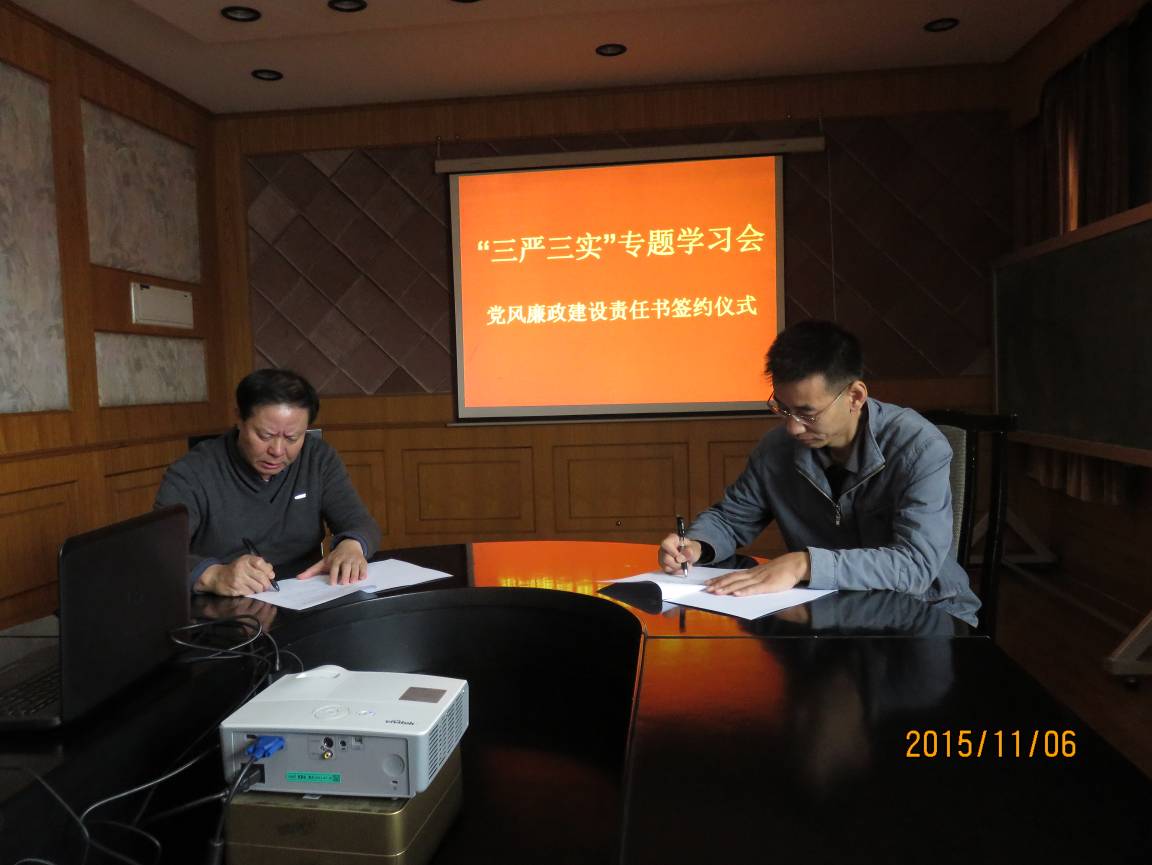 为全面贯彻落实从严治党要求,巩固和拓展党的群众路线教育实践活动成果,持续推进思想政治建设和作风建设,东海站党委于11月6日上午组织开展“三严三实”专题学习会暨党风廉政建设责任制签约仪式,站领导班子成员、中层及以上管理干部、课题组长和党支部书记等近20名同志参加了学习会。会议由党委书记、站长胡长青主持。