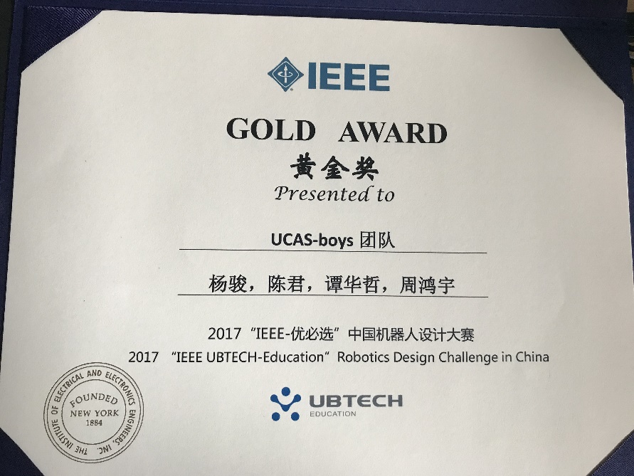 2017年8月5日,首届“IEEE-优必选中国机器人设计大赛”总决赛在深圳圆满收官,本次比赛共有来自全国各高校的上百支团队,超过800名学生参加。决赛中,来自两岸三地的26支战队汇聚深圳,展开了一场创意与技术间的激烈较量。最终,中科院声学所国家网络新媒体工程技术研究中心博士生杨骏同学率领的中国科学院大学UCAS Boys队荣获大赛金奖。