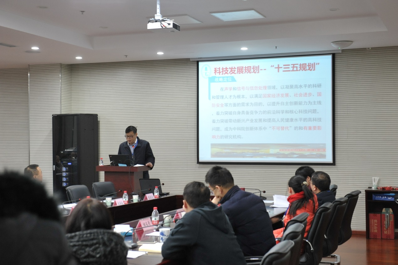 东海站站长许伟杰首先对东海站“十三五”规划推进和落实情况进行了汇报。东海站“十三五”规划以十八届三中全会全面深化改革和中科院“率先行动”计划的精神为指引,以声学所“十三五”期间实现重点跨越的阶段目标为方向,过去的两年里,在水声导航、水声定位、水声探测、对抗技术、超声应用技术、数字及信息处理技术和医疗声学技术等科研领域得到了长足的发展,科研项目有序开展,科研经费稳中有升。在平台建设方面,东海站于2016年9月完成全部搬迁,同年也完成了小木桥路水池的修缮工作,中科院“十三五”科教基础设施建设项目也已经完成可研报告编制工作,东海战积极推进中科院“3H”工程建设,人才公寓的使用为东海站引进优秀人才提供保障。2017年东海站完成了针对35岁以下青年员工的“英才计划”部署立项,为科研人员独立开展课题提供了平台,同时东海站的高级职称比例也从十二五的13%提升至目前的17%。2018年是十三五规划实施的攻坚年,东海站要居安思危,充分认识在发展环境、人才培养、基础研究、成果转化等方面所面临的问题,东海站要有能力、有担当,做到不忘初心、脚踏实地完成既定目标,进而取得更高的成就。