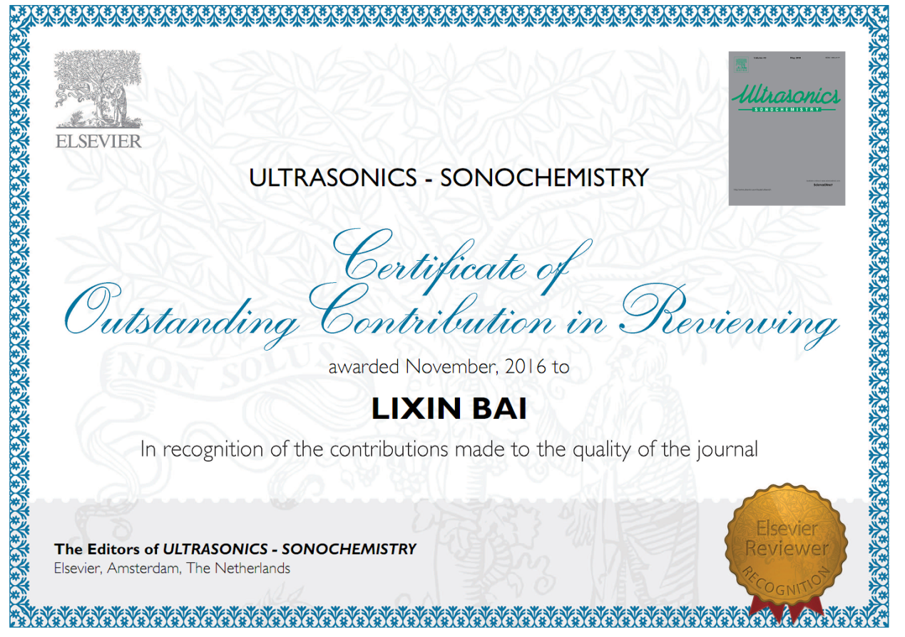 《Ultrasonics - Sonochemistry》期刊影响因子4.218,是声学领域的优秀期刊。该奖项授予该期刊最出色的前十位审稿人。白立新同时也是该期刊稳定的供稿者,以第一作者或通讯作者在该期刊发表8篇超声空化云研究论文。