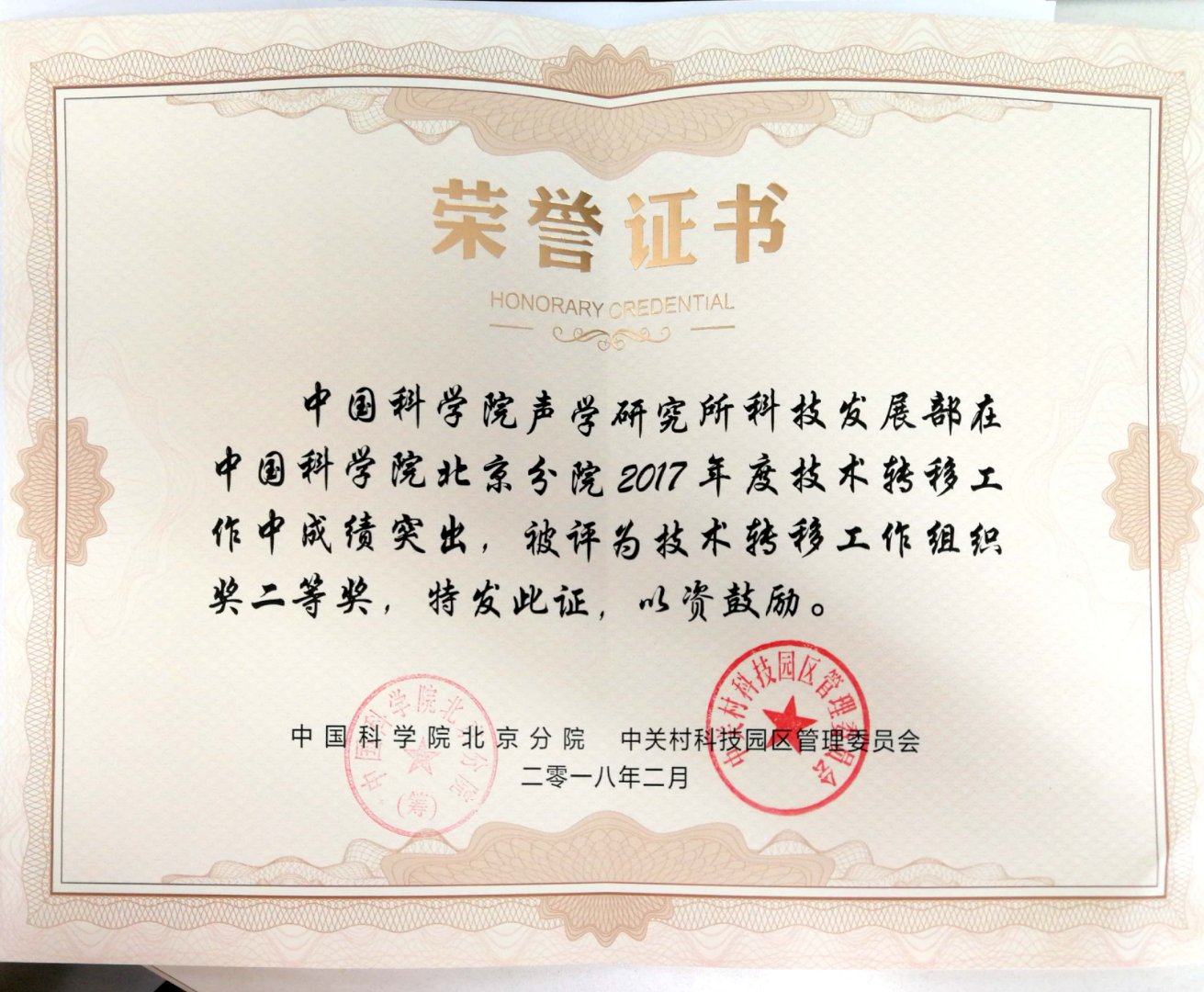 近日,中国科学院北京分院对2017年度科技成果在京转化工作进行了表彰,声学所科技发展部获评2017年度“中国科学院北京分院技术转移工作组织奖二等奖”。该奖项是为深入落实《中国科学院-北京市人民政府联合推动中关村国家自主创新示范区建设协议》精神,深入挖掘中科院科技资源潜力,促进中科院科技成果在京转化和产业化,加快中关村国家自主创新示范区建设而设立,并经过中科院北京分院和中关村科技园区管理委员会联合评选产生。