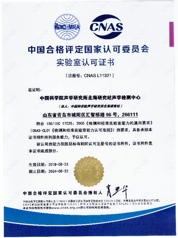日前中国科学院声学研究所青岛分所暨北海研究站声学检测中心(以下简称声学检测中心)顺利通过中国合格评定国家认可委员会专家组审核,获授CNAS/CMA实验室认可证书。此次认证确认范围涵盖了15个检测对象/领域,28个检测项目/参数,57个检测标准(含国标和ISO对标标准),成为国内北方地区声学检测领域覆盖检测标准最多的专业检测机构。