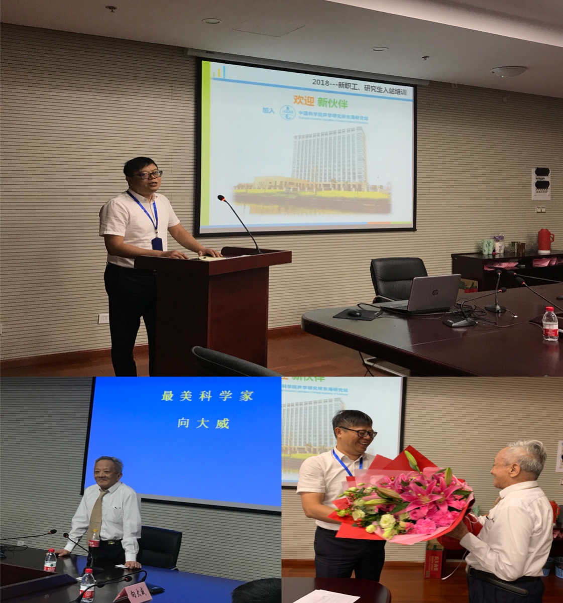 10月10日上午九点,2018年新职工和从北京国科大回站的研二学生们集中在一楼报告厅内。入站培训由副站长刘晓隽主持。今年10月恰逢向大威教授在东海研究站工作60周年,站长许伟杰为向教授献花祝贺并表示深深的感谢和敬意!许伟杰对新成员的加入表示热烈欢迎,他向大家介绍了东海站的发展历史和未来规划,鼓励大家学习东海站老一代科研工作者甘于奉献、勇于拼搏的精神,牢记“标新立异、一丝不苟、奋力拼搏、亲自动手”的所训,希望新成员与东海站共同进步,共同发展。