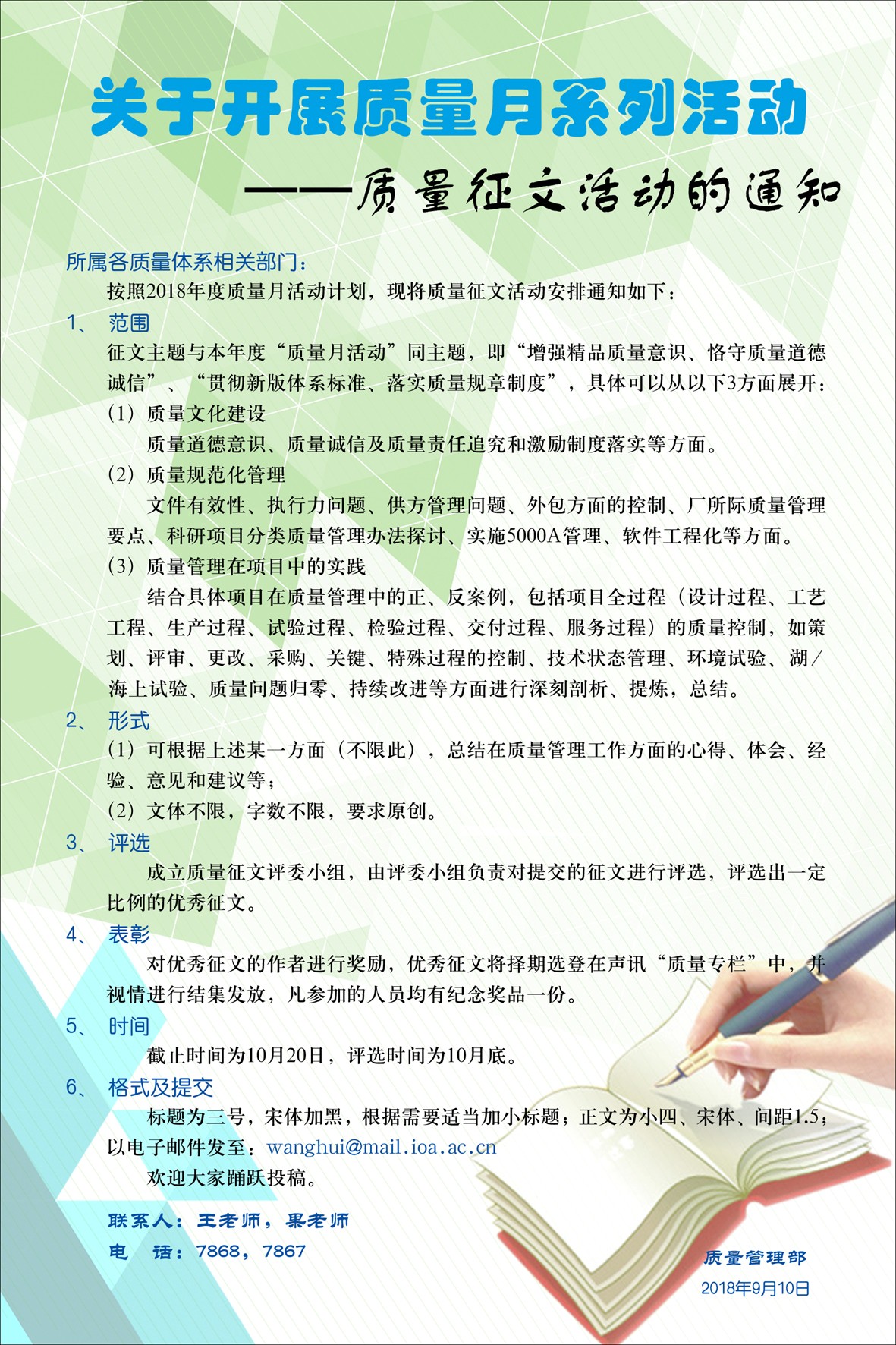 2018年全国质量月活动的主题是“质量第一、严格管理、质量提升、高质量发展”。为响应国家号召,也为进一步强化9001C新标准的学习,提高全员的质量意识,推动本所的质量文化建设,声学所在9-10月期间,围绕“增强精品质量意识、恪守质量道德诚信”;“贯彻新版体系标准、落实质量规章制度”两项主题,认真策划、精心组织、广泛动员,开展了第十一届质量月活动。