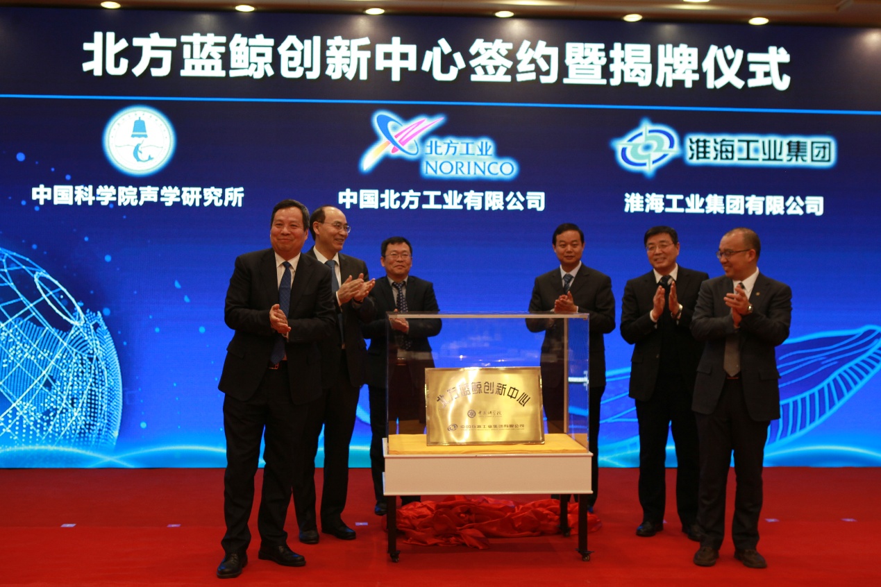 2019年1月16日上午,中科院声学所、中国北方工业公司、淮海工业集团在北京北方大厦联合举办“北方蓝鲸创新中心”签约暨揭牌仪式,三方代表共同签订了联合成立“北方蓝鲸创新中心”协议,中科院重任局局长于英杰、中国兵器工业集团副总经理李春建、北方工业公司总裁植玉林、淮海工业集团董事长何清、声学所所长王小民、副所长马晓川等共同为“北方蓝鲸创新中心”揭牌。中科院重任局综合技术处处长郭晓勇、信息海洋处处长李才兴及兵器工业集团公司、北方工业公司、淮海工业集团等单位相关部门领导出席仪式。