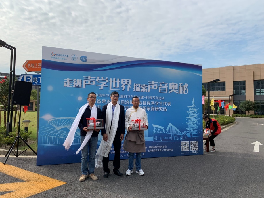 中国科学院上海分院学术与科普处处长章文俊,嘉定区科学技术协会副主席陆荣荣,嘉定工业区管委会副主任陈惠芬、服务中心企业服务科副科长戴柳,久治县县政府办公室副主任、嘉定区援青干部刘峰,久治县白玉乡藏文寄宿制完全小学校长李亮,上海国际汽车城人才培训学院党支部副书记、副院长朱晔,中国声学学会办公室钟平,东海研究站站长许伟杰、科研科科长诸向阳等领导及嘉宾出席活动开幕仪式。