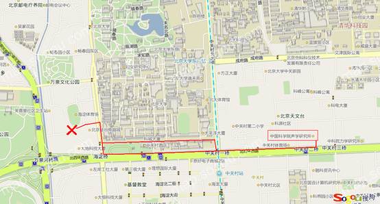 红“×”所示即为海淀游泳馆,路线用红线标出。可以沿北四环一直走到海淀桥后向北转入颐和园路;也可以在过了中关村大街后走海淀路,就是北大南门前的那条路,到了颐和园路再向北(右)拐。