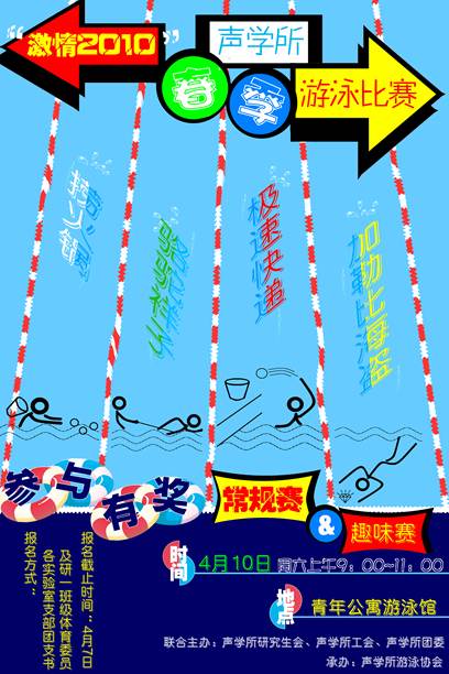 协会不定期举办一次所内游泳比赛,比赛项目分为常规赛和趣味赛。常规赛通常包括蛙泳、自由泳和接力赛。趣味赛则每年都会推陈出新,力图给广大参赛选手带来更多乐趣。以下是2010年4月游泳比赛的照片以及比赛的宣传海报: