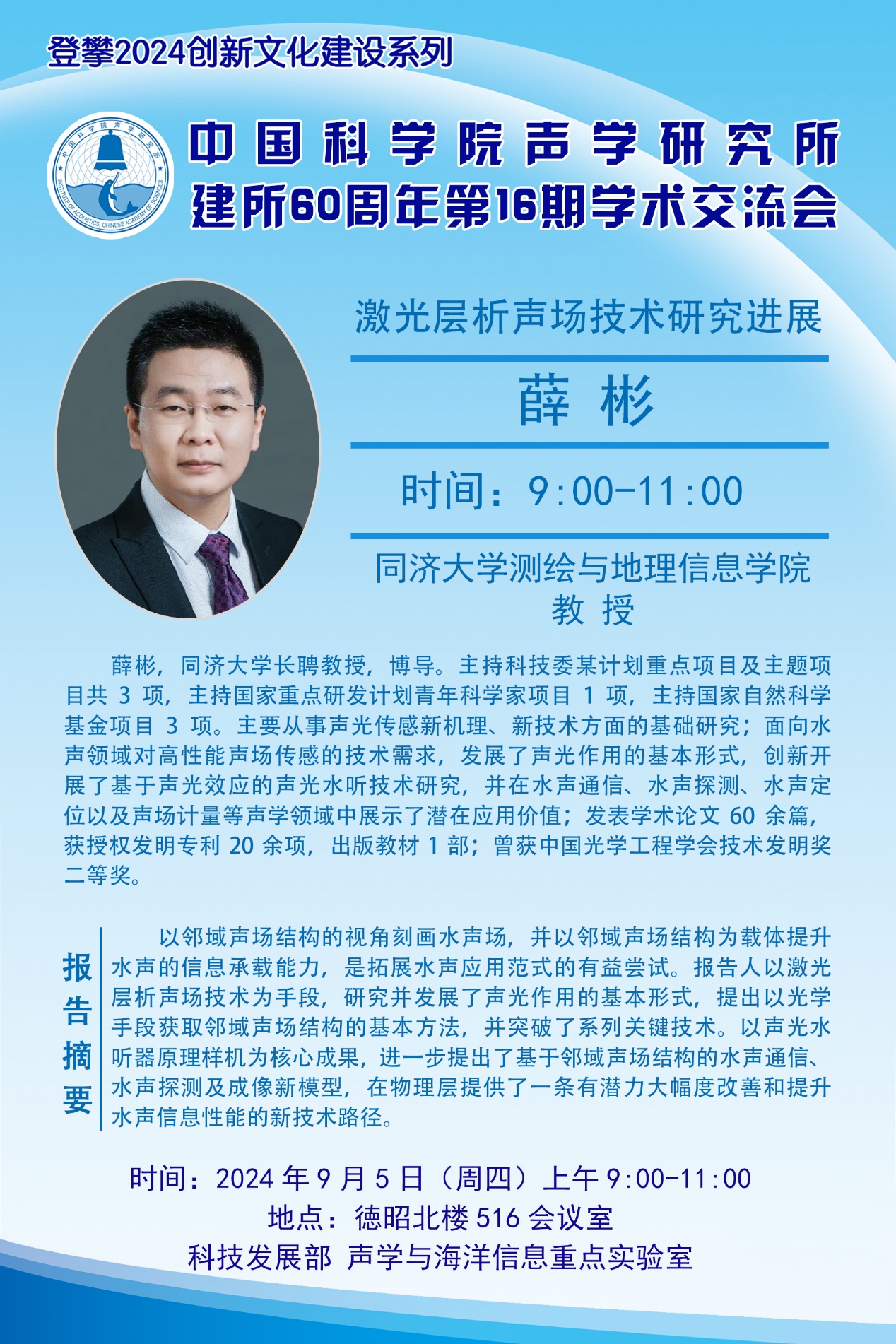 1964年,为落实国家声学规划,满足国家迫切需要,形成全国声学学科研究中心,经国务院副总理聂荣臻元帅批准,成立中国科学院声学研究所(以下简称声学所),将原中科院电子所的水声、超声、建筑声3个实验室,1958年成立的南海研究站、1960年成立的东海研究站、1961年成立的北海研究站整体纳入声学所。声学所是从事声学和信息处理技术研究的综...