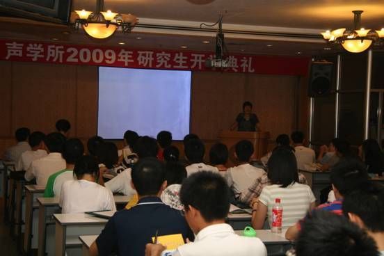 声学所2009级研究生开学典礼及入所教育于2009年9月4日上午在DSP大楼多功能厅举行,2009级博士及硕士新生100余人参加了此次会议。人事教育处卢老师主持了开学典礼,声学所副书记、副所长王小民到会致辞。