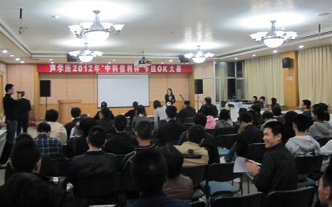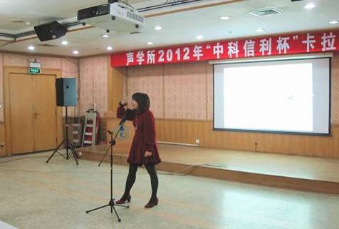 10月19日晚,大家期待已久的 “声学所好声音”—声学所2012年“中科信利杯”卡拉OK大赛预赛在DSP楼多功能厅如期举行。该比赛由所工会、所团委主办,所研究生会文艺部承办,并由中科信利实验室大力赞助。旨在丰富全所学生及职工的业余生活,并给声学所广大歌唱爱好者提供一个交流切磋的平台。