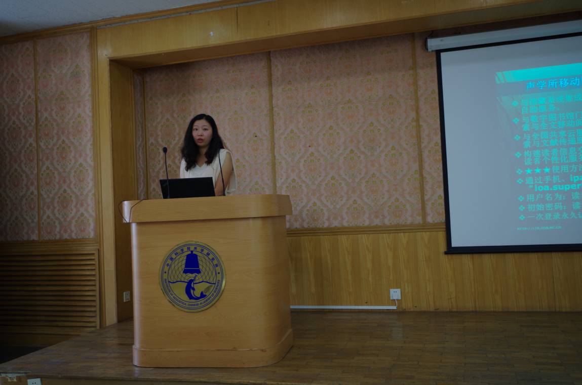 在图书馆使用方面,声学所图书馆张莉莉老师对所图书馆进行了简要介绍。张老师重点介绍了所图书馆藏书情况和如何使用我所数字化图书馆进行数据检索和文献借阅。通过介绍,同学们对所图书馆有了进一步的了解。