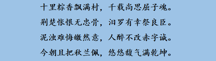 有作品借端午佳节歌颂了屈原宁死不悔的忠肝义胆,且看今朝后辈学子继承其意志不改初心。