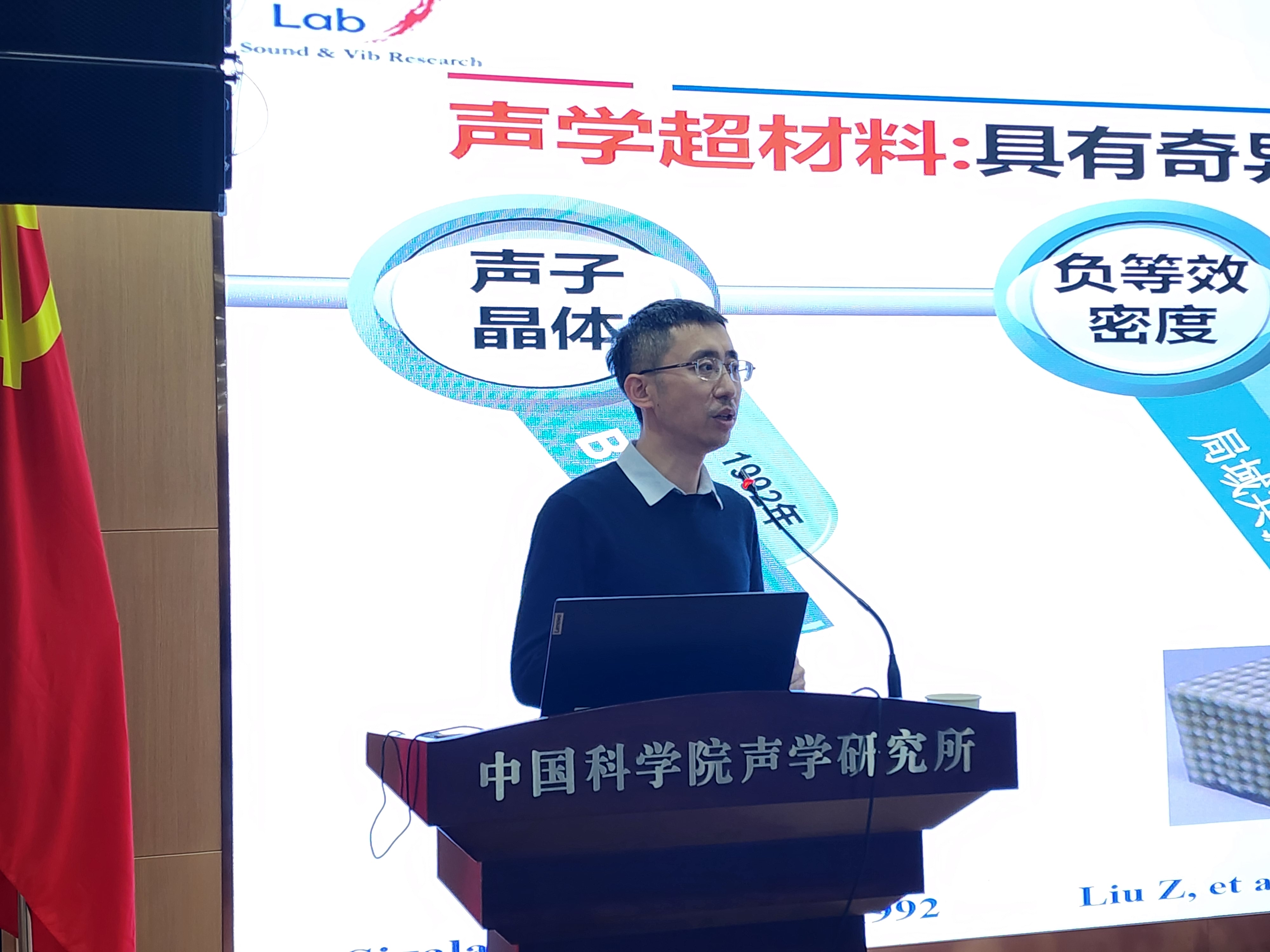 贾晗研究员作《阻抗匹配型水声器件设计与验证》的报告。报告从声学超材料与变换声学特点出发,详细介绍了梯度折射率透镜、水下隐身毯及水气阻抗匹配层三种阻抗匹配型水声器件等研究内容,为未来的学科交叉融合创新发展提供了新思路。