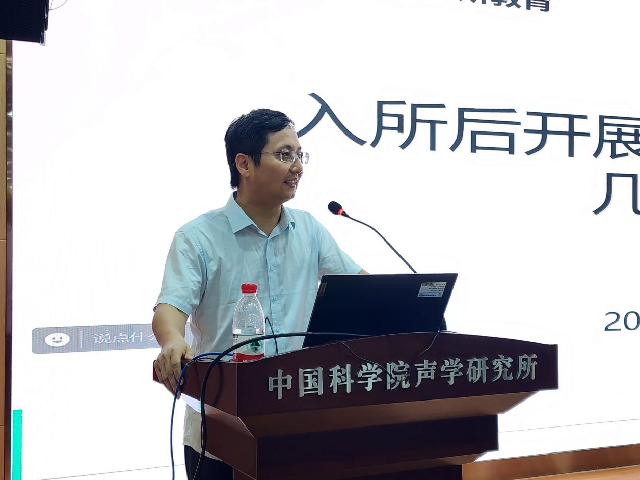 在导师说环节,语音与智能信息处理实验室主任张鹏远研究员以《入所后开展学习科研工作的几点建议》为题,从导师的四点期望以及过往学生中常碰到的四点问题出发,结合实例介绍了同学们回所后如何尽快更好的进入科研状态,如何解决在科研阶段碰到的难题。最后,他祝愿同学们乘风破浪,在声学所这个书写绚丽青春。