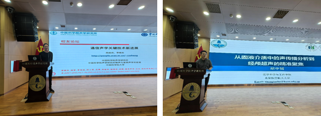 接着,中国科学院声学研究所郑成诗研究员和北京航空航天大学胡中韬副教授作为校友代表受邀分别做了《通信声学关键技术新进展》和《从固液介质中的声传播分析到经颅超声的精准聚焦》学术报告。他们结合自身的科研经历和成果,向大家展示了声学领域的前沿动态和发展趋势,让学生们受益匪浅。