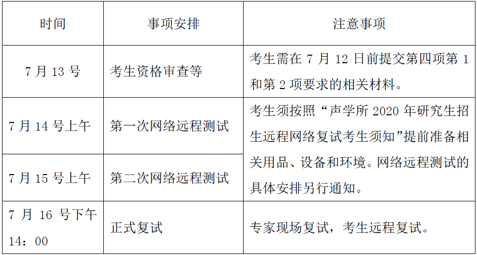 4. 须按照《声学所2020年研究生招生远程网络复试考生须知》(附件4)的要求准备网络复试用品、设备和环境,及时参加声学所组织的远程网络测试等工作。
