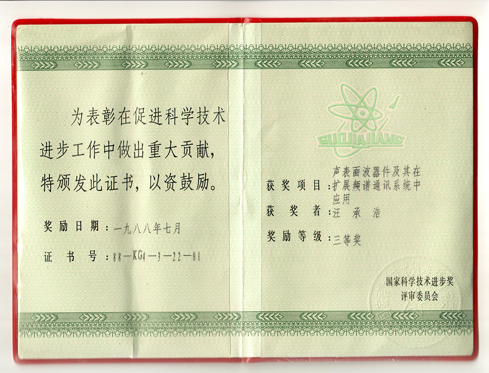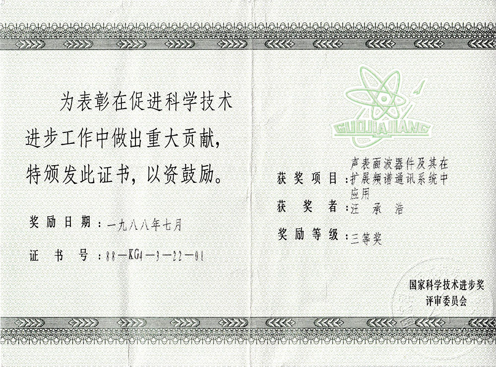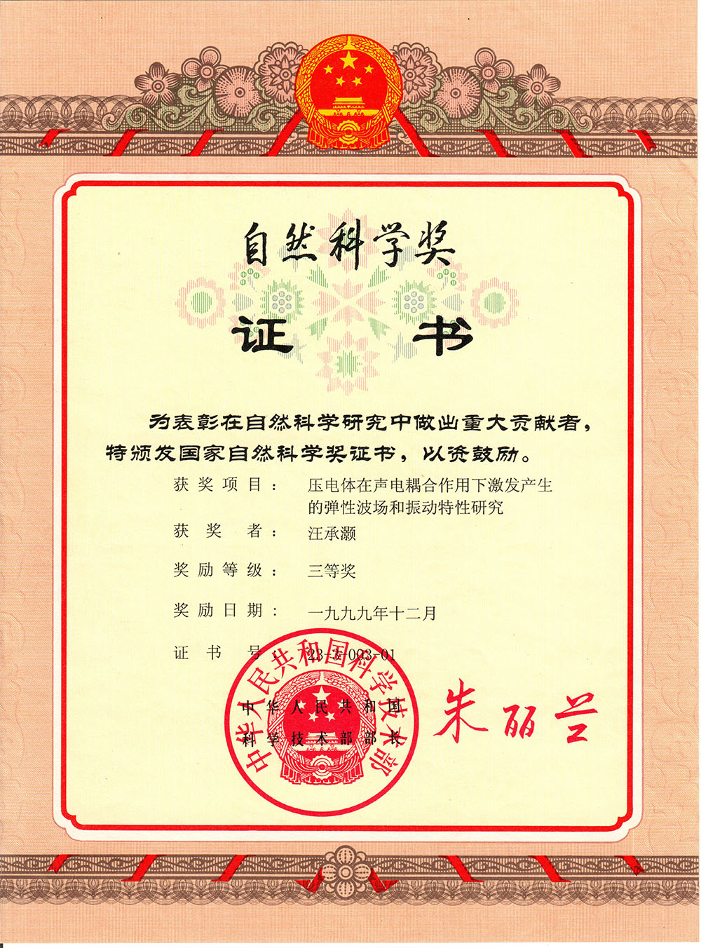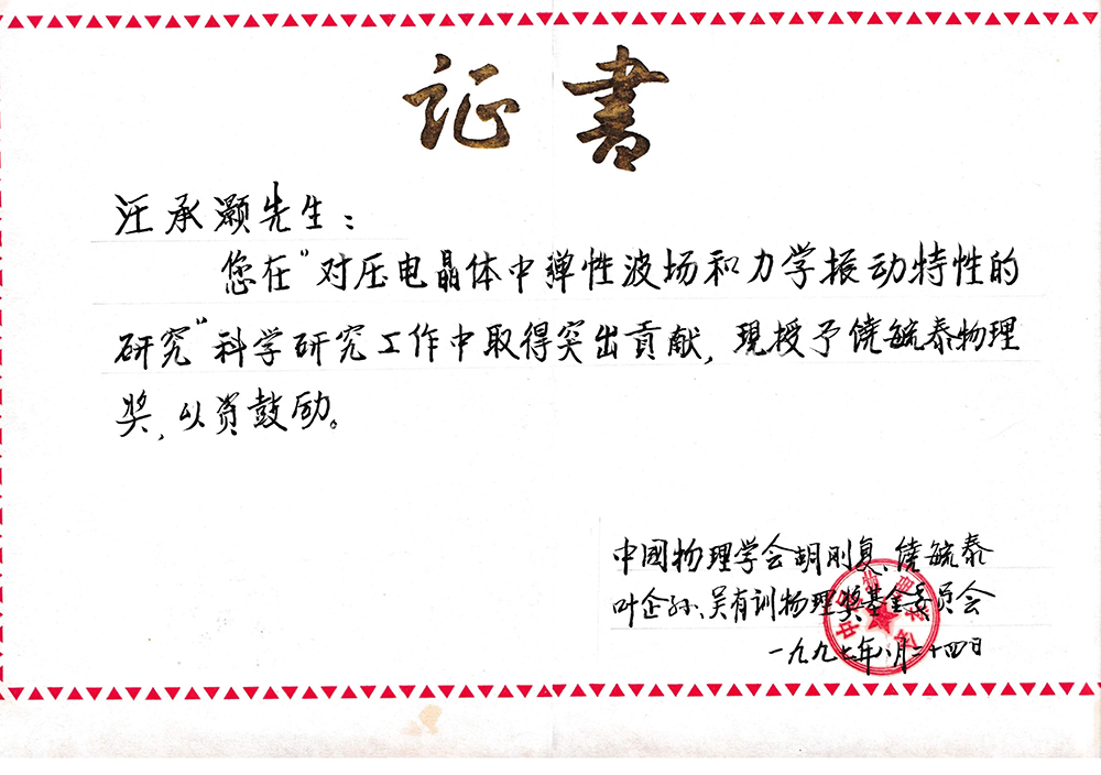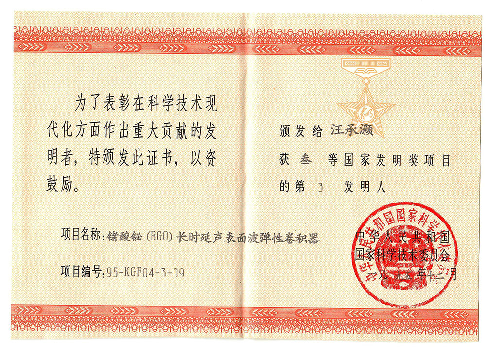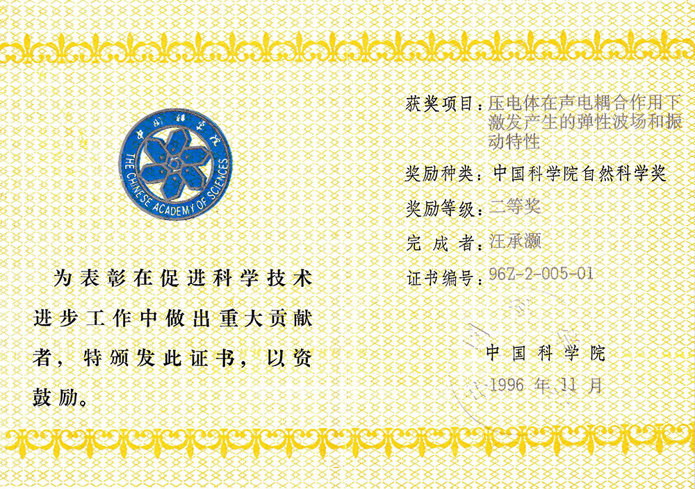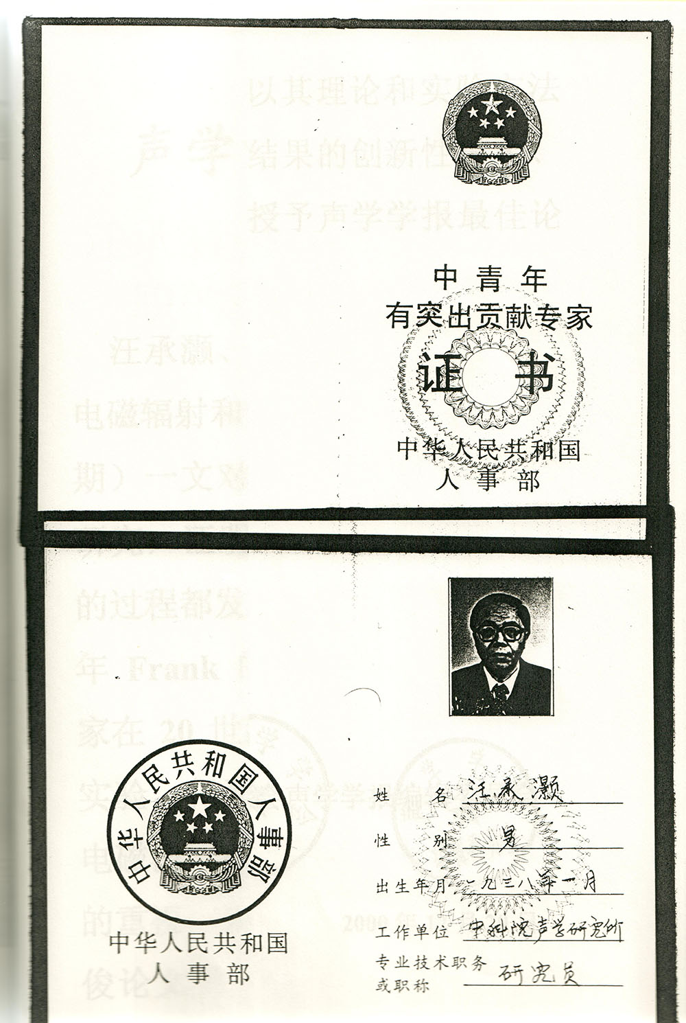 汪承灏同志,男,汉族,1938年1月10日出生于南京。1958年本科毕业于北京大学物理系,1958年至1964年在中国科学院电子学研究所工作,1964年起在中国科学院声学研究所工作,1986年起任研究员、博士生导师,曾任超声电子学实验室主任,中国科学院声学研究所学术委员会主任。2001年当选为中国科学院院士。