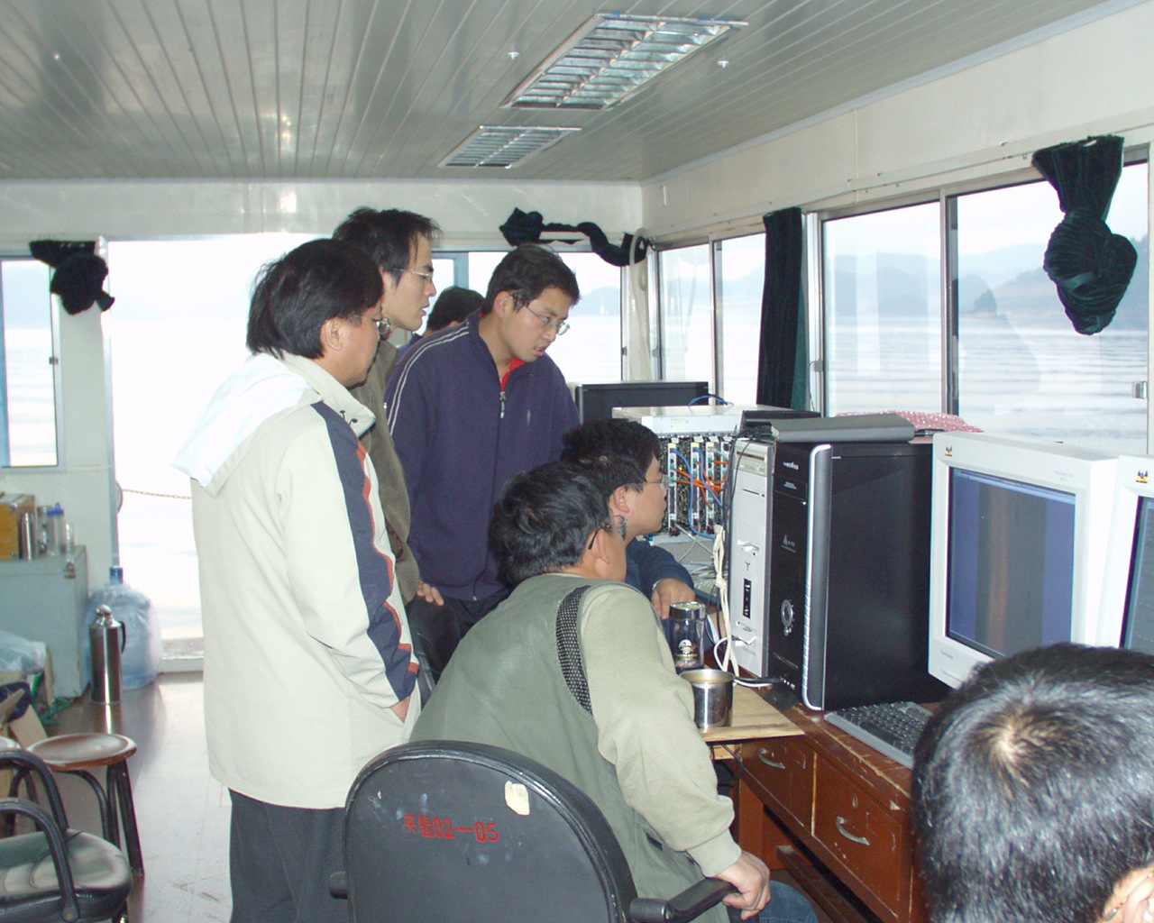 在科技部、院所各级领导和专家的关心和支持下,项目组全体科研人员发扬艰苦奋斗、开拓创新的拼搏精神,于2005年8月完成整个系统的联调。为了验证整套系统的各项指标和可靠性,为海试试验做充分的准备,项目组安排了湖试试验作为海试样机下海前的“热身”,并于2005年9月开赴千岛湖进行湖试试验。