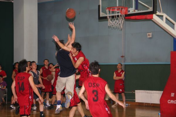 主裁一声哨响,比赛开始,DSP跳球得手.开场时,双方都在适应场地,比赛进行了两分多钟,才由DSP的周海泉同学命中第一个球.之后DSP便展开了取分高潮,在十五分钟内拿下20分.刘建同学在这段时间里,连续打成三次快攻,将现场观众的气氛推向高潮.相比DSP篮球队的得心应手,机关篮球队迟迟未能进入状态.整个上半场靠1罚1投,拿下三分,以3比25结束比赛上半时.