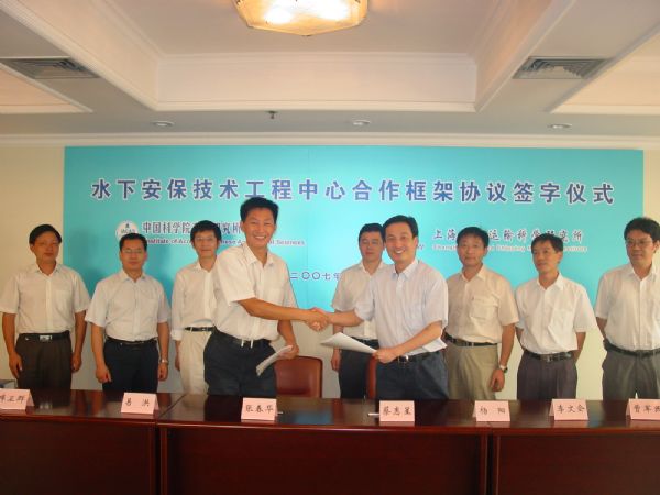 2007年7月31日,中科院声学所与上海船舶运输科学研究所共建水下安保技术工程中心合作框架协议签字仪式在上海举行。声学所张春华副所长、易洪所长助理、科技处库卫群处长、图像声纳技术实验室许枫主任和上海船舶运输科学研究所蔡惠星副所长、杨阳所长助理、水声电子部李文会主任等同志参加了签字仪式,张春华副所长和蔡惠星副所长分别代表共建双方在合作框架协议上签字,并共同为水下安保技术工程中心揭牌。
