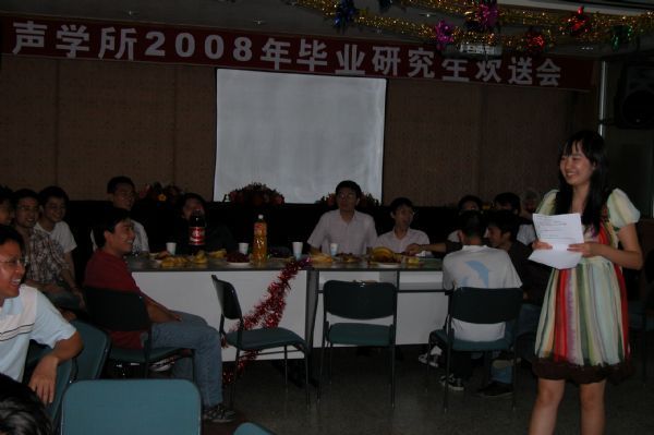随着主持人宣布本次2008届毕业生欢送会开始,各位毕业生代表和其他年级的同学联决献上了各种精彩的节目: DSP实验室的同学献上了一曲合唱《朋友》;叶利剑同学表演了笛子独奏;重点室和超声实验室的同学合唱了一曲《明天会更好》,欢送会现场一直掌声不断。此外,在节目表演中还穿插了各种游戏环节:吸管运输、塞嘴巴、正话反说、夹气球跑、抢凳子、扮时钟和心有灵犀等,游戏妙趣横生,引来阵阵欢笑,整个大厅都沉浸在一片欢声笑语中……