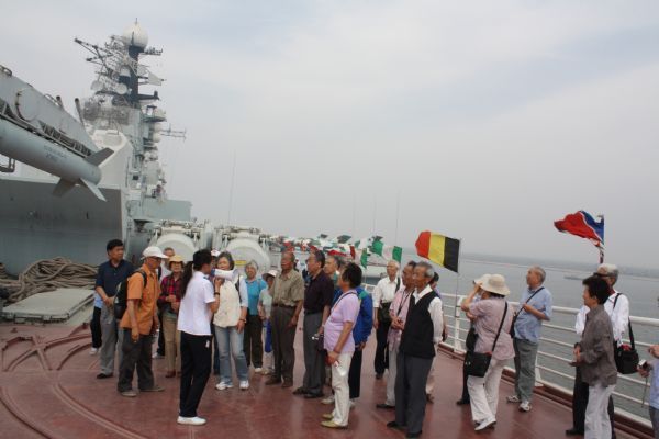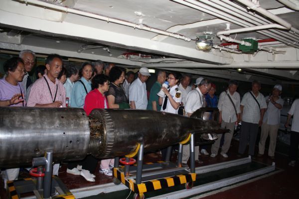 登舰后,大家在导游的介绍中,参观游历航母甲板、武备、机库、鱼雷舱、声纳舱、官兵生活区域、各功能舱室等内容。首期开放面积约 3万平方米,整个游览时间约为3~4小时,二期还将开放舰岛等上层部分。舰内开辟有基辅号军事生活展、世界航母博物馆、世界兵器展、水下武器展等极为精彩的“四大展示”项目,还有珍贵的基辅号资料片、世界海军与航母发展史等资料影片供观赏。舰上还设有航母纪念品、兵器模型、酒水吧、军事收藏品、俄罗斯工艺/纪念品等独具特色的旅游商业服务。不仅让人震撼于海上霸王的昔日雄威,徜徉于现代军事的知识海洋,更使人怡神于缤纷精彩的海上世界。
