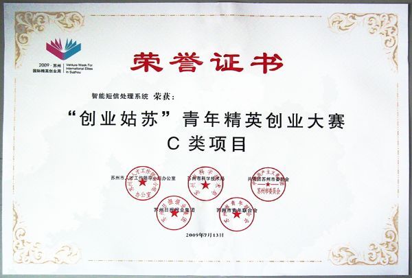 由苏州市人才办、科技局、团市委等联合举办的“创业姑苏”青年精英创业大赛于2009年7月13日在苏州市会议中心举行颁奖签约仪式,苏州市委副书记徐建明、市委常委、副市长周伟强以及钱海鑫、程耀寰等市领导出席了颁奖典礼。中国科学院也派出了由院团委带队,由各研究所专家组成的专家团一行十三人参加了颁奖大会。