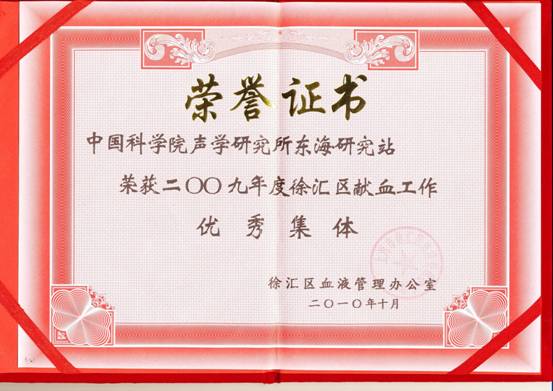 10月26日,上海市徐汇区血液管理办公室发文表彰2009年度市、区级献血工作优秀集体和个人。中科院声学所东海研究站获得“2009年度徐汇区献血工作优秀集体”荣誉称号。该荣誉是对该站近年来的献血工作成绩认可,也是对该站职工、研究生积极弘扬无私奉献精神的鼓励。