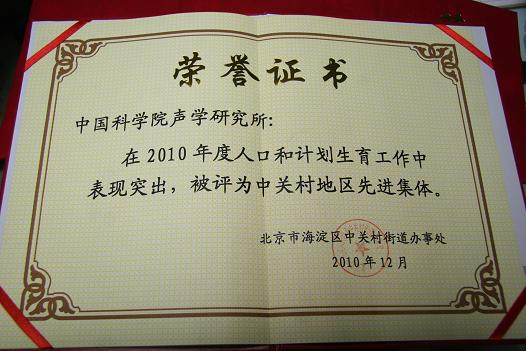 日前,声学所被评为“2010年度中关村地区人口与计划生育工作先进集体”,这是继2006年以来,声学所连续五年获此荣誉。王小民所长被评为“2010年度中关村地区人口与计划生育工作好领导”;杨丽同志被评为“2010年度中关村地区人口与计划生育工作先进个人”,中关村街道办事处特发荣誉证书予以表彰。