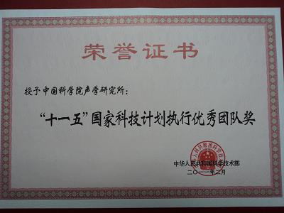 为全面贯彻党的十七大和十七届五中全会精神,表彰先进,弘扬创新求实精神,提振信心,鼓舞广大科技工作者在“十二五”期间做出更大贡献,在2011年全国科学技术大会上,科技部对 “十一五”国家科技计划工作先进集体和先进个人进行了表彰,声学所获“十一五”国家科技计划执行优秀团队奖。同时,我所参加的“‘蛟龙号’载人潜水器1000米和3000米海试项目”和我所国家网络新媒体工程技术研究中心参加的“新一代高可信网络”研发项目也获得了优秀团队奖。