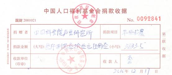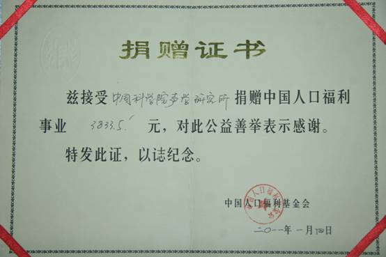 近日,声学所收到由由中国人口福利基金会颁发的捐赠证书,表彰声学所对中国人口福利事业做出的贡献。