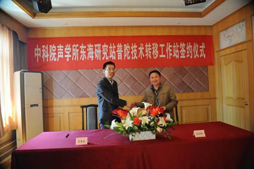 2011年4月12日上午,中国科学院声学研究所东海研究站与舟山市普陀区政府共建东海研究站普陀技术转移工作站签约仪式在东海研究站举行。舟山市普陀区科技局局长水开明、副局长贺勉、舟山海洋科技有限公司总经理龚剑彬、舟山新明舟水产食品有限公司总经理肖天明、中科院声学所东海研究站站长胡长青、副站长关平、科研科科长张伟才、研究员王润田等出席了签约仪式。