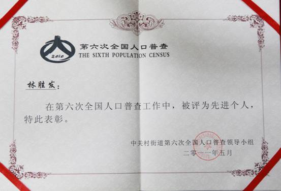 在第六次全国人口普查工作中,林胜发同志刻苦钻研,全面熟练地掌握了人口普查业务知识,严格按照《全国人口普查条例》和普查方案要求,坚持实事求是的原则,工作认真,严谨细致,吃苦耐劳,并在工作中充分发挥个人主观能动性,较好地完成了各项工作,得到社区普查领导小组的一致好评。