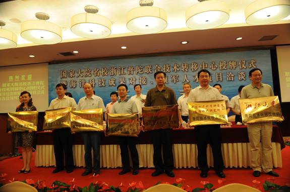 2011年7月12日上午,“国家大院名校浙江普陀联合技术转移中心授牌仪式暨海洋科技成果对接、领军人才项目洽谈会”在浙江省舟山市中瀚大酒店召开。浙江省科技厅副厅长王宏理、舟山市副市长朱世强以及中科院声学所东海站等十一家科研院所和高校领导专家参加了此次活动。中科院声学所东海站副站长关平代表中科院声学所参加了“中科院声学所普陀技术转移工作站”的授牌仪式,王润田研究员和张伟才科长代表东海站与舟山企业分别签订了“基于声学原理应用于海域工程勘测的物探技术研发协议”和“海水鱼类精准养殖监控技术与装备研发协议”。7月12日下午,“中科院声学所普陀技术转移工作站”入驻仪式在浙江普陀联合技术转移中心举行。