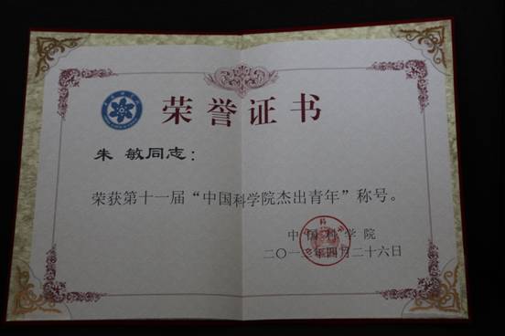 2012年5月3日,中国科学院团委召开庆祝建团90周年暨“党团共建、创先争优”表彰大会,声学所海洋声学技术实验室主任、研究员朱敏同志荣获第十一届“中国科学院十大杰出青年”荣誉称号。